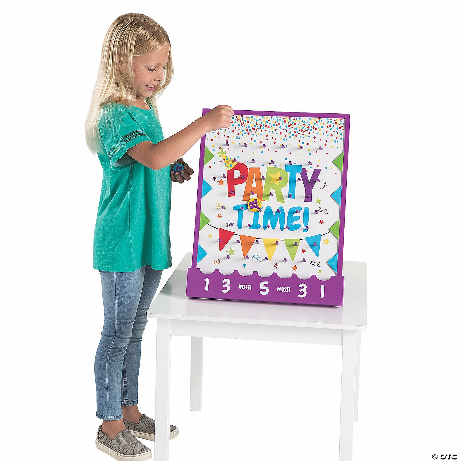Nothing livens up party supplies like this fun disc drop game! The colorful party game board is printed with βParty Time!β along with confetti and a banner. Set up the game at your childβs birthday party, or keep it on hand in to celebrate classroom birthdays. Be sure to stock up on giveaway toys and candy assortments to use as prizes for the game players! Wood. Board, 15 3/4″ x 20 1/4″; six discs, 1 1/2″ diam.; support dowel, 20 1/2″. Simple assembly required. Β© OTC