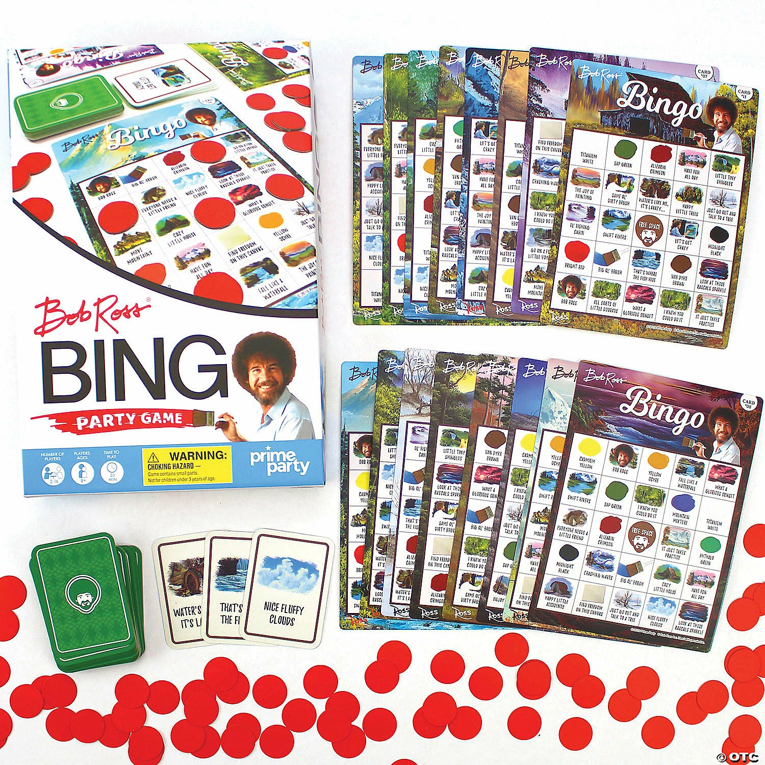 The ultimate party game now has the best theme – Bob Ross! This bingo game set features classic Bob Ross moments and icons and is great for all occasions, not just parties. Grab one for your next family game night! Cardstock. Includes 16 bingo cards, 400 bingo chips, 1 call sheet board, 42 calling cards and instructions. Box, 7″ x 10″.
