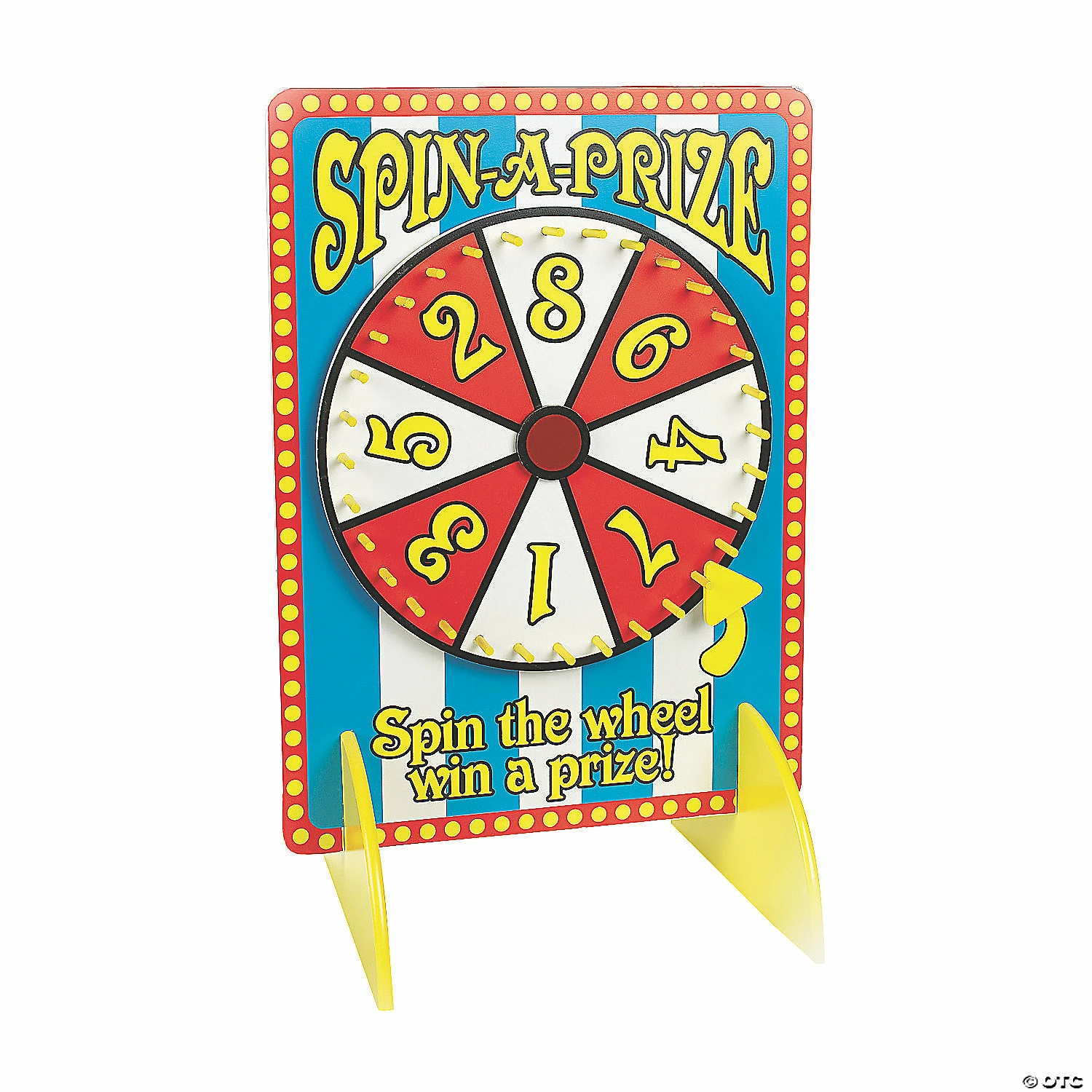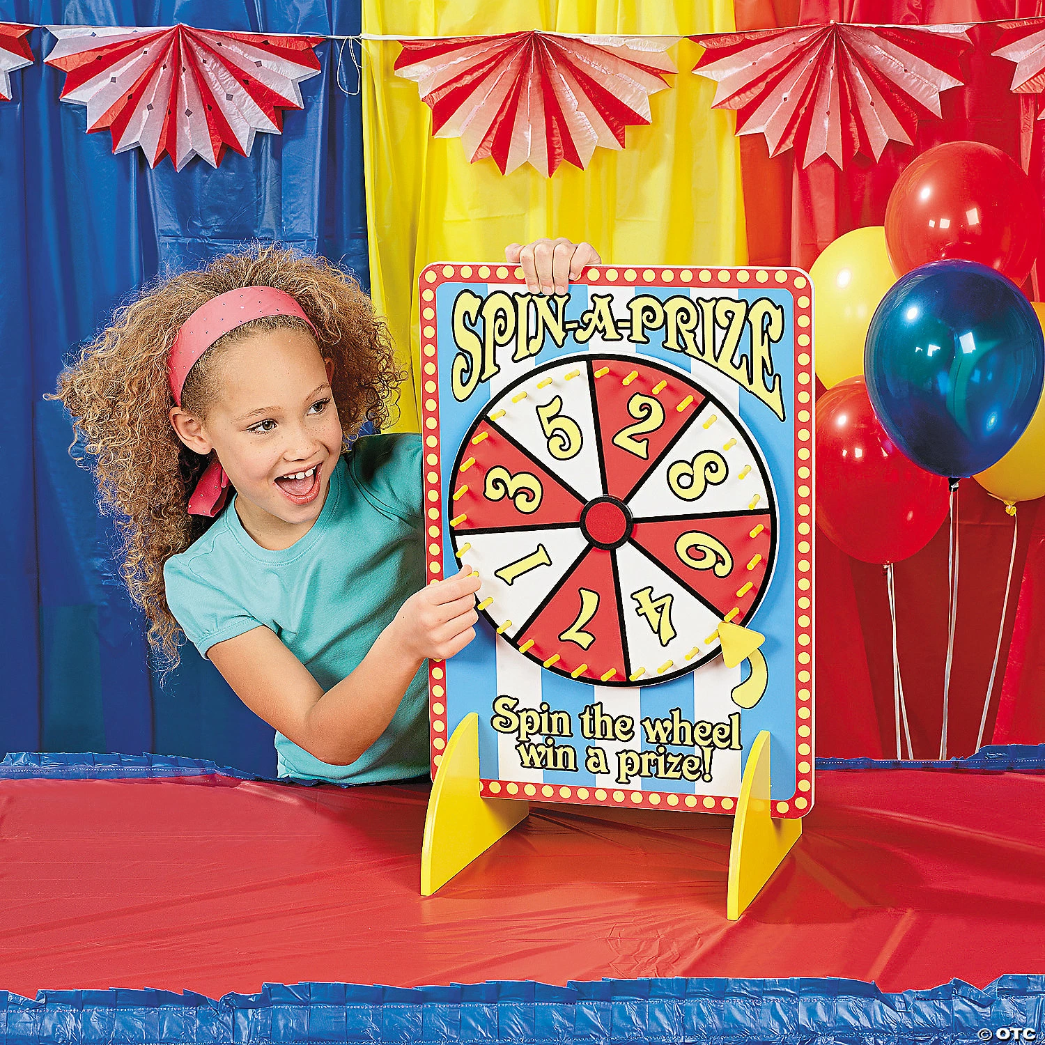 Give this wooden prize wheel a spin at your next carnival! Printed with “Spin-A-Prize” and “Spin the wheel win a prize!”, this Carnival Prize Wheel is a big hit with kids! Great for classroom Halloween parties too! 22 1/4″ x 14 3/4″ Simple assembly required. ยฉ OTC