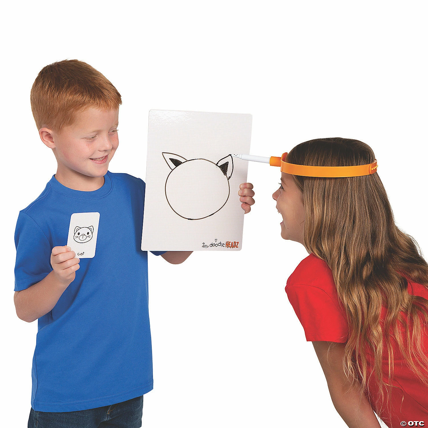 Looking for a fun game that challenges your way of thinking? This Doodle Headz game takes the phrase “using your head” to a different level! Divide into two teams and take turns wearing the headband with the dry erase marker and try and draw the object on the card that you pulled on the dry erase board. The team that has the most correct drawing guesses wins! (58 pcs. per set) Includes: two adjustable plastic headbands, 25 1/2″; two plastic dry erase markers, 5″; two cardstock dry erase boards, 8 1/2″ x 11″; fifty cardstock cards and one instruction card, 2 1/4″ x 3 1/2″; all in a 10″ x 12″ with 8 1/2″ handles nonwoven polyester tote bag. © OTC