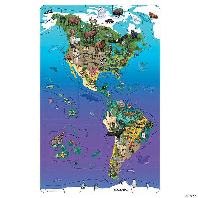 Discover 100+ endangered, threatened, and common animals in their habitats! Learn geography and animal facts, build fine motor skills, and more! Board shows animal silhouettes and names to help children place the right pieces. Multi-continent, 50-piece jigsaw puzzle (North America, South America, and Antarctica) features hanger holes and stunning artwork in rich colors. Large animal fact sheet included. Hang separately or with our other two maps (sold separately) for beautiful, worldwide decor in the classroom, playroom, or bedroom! Board measures 11.5″ W x 18″ H. Ages 3+/Grades PreK+