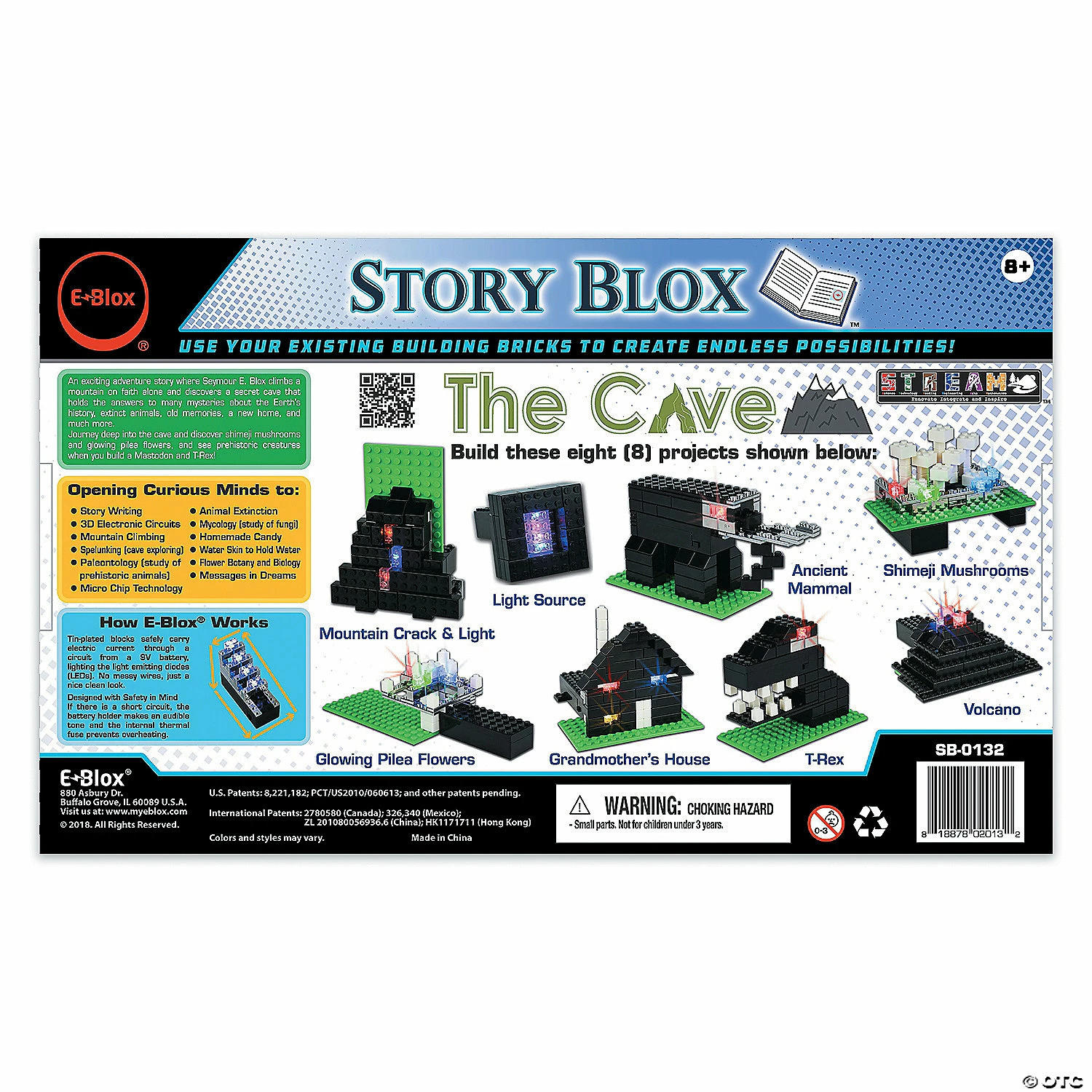 E-Blox® are not your ordinary building blocks. Not only can they be used to build your creations, they can also bring them to life! E-Blox® use our patented technology, which consists of tin plated blocks that connect to a battery block, powering the electrical component blocks. The plated blocks are used to seamlessly integrate electronic circuitry into your builds to illuminate them with no wires. The Cave is a chapter in the E-Blox® novelette “Earth One”. An exciting adventure story where Seymour E. Blox climbs a mountain on faith alone and discovers a secret cave that holds the answers to many mysteries about the Earth’s history, extinct animals, old memories, a new home, and much more. Journey deep into the cave and discover shimeji mushrooms and glowing pilea flowers, and prehistoric creatures when you build a Mastodon and T-Rex! Includes 12-page storybook and 92-page assembly manual E-Blox are also compatible with other brick sets making the possibilities as endless as your imagination. Requires a 9-volt battery (not included).• Jump into a story of adventure with Seymour E. Blox.• Build 3D models that are part of the story using tin-plated blocks that safely integrate electronic circuitry throughout your creations• Illuminate your build-outs with no messy wires• Includes 118 blocks, 12-page storybook and 92-page assembly manual