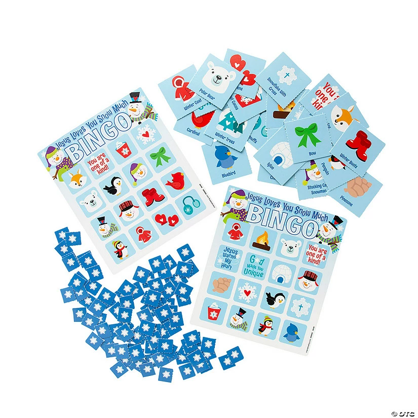 Wintertime got you feeling cold and blue? Warm up with Jesus and a game of bingo or two! Kids will have a blast covering their squares with little snowflakes as they’re reminded that Jesus loves them snow much. Great for holiday parties, indoor recess or Sunday school. Paper. (22 pcs. per unit) Sixteen 6″ x 8″ game cards; two 6″ x 8″ sheets each with 12 callout cards; four 6″ x 8″ sheets each with 99 chips. © OTC