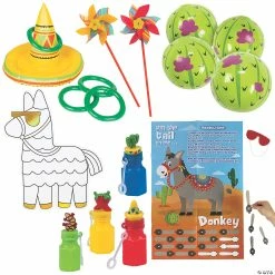Celebrate Cinco de Mayo in style, or plan a festive celebration with the help of this boredom buster kit! This set features a variety of party games, activities, toys and favors that will keep the good vibes going all party long. Not just for parties, you and your family can have your own fiesta fun anytime with this boredom buster kit. (70 pcs. per unit) Assortment may vary.Includes:β’ 12 Vinyl Inflatable Mini Cactus Beach Balls (Inflated, 5″)β’ 12 Cardstock Color Your Own Jumbo PiΓ±ata Cutouts with Foil Accents (6 1/4″ x 7 3/4″)β’ 12 Plastic Fiesta Character Bubble Bottles (Each .6-oz. plastic bottle of bubbles includes a wand. 3 1/4″)β’ 17-Pc. Paper Fiesta Pin the Tail on the Donkey Game (Includes a cardboard blindfold with elastic band, poster and fifteen tails. 22″ x 33 1/2″)β’ 12 Plastic Fiesta Pinwheels (Each 6″ pinwheel is on a 12″ stick)β’ 5-Pc. Vinyl Inflatable Fiesta Sombrero Ring Toss Game (Inflated, 20″ x 24″ diam. with four 10″ diam. rings.)