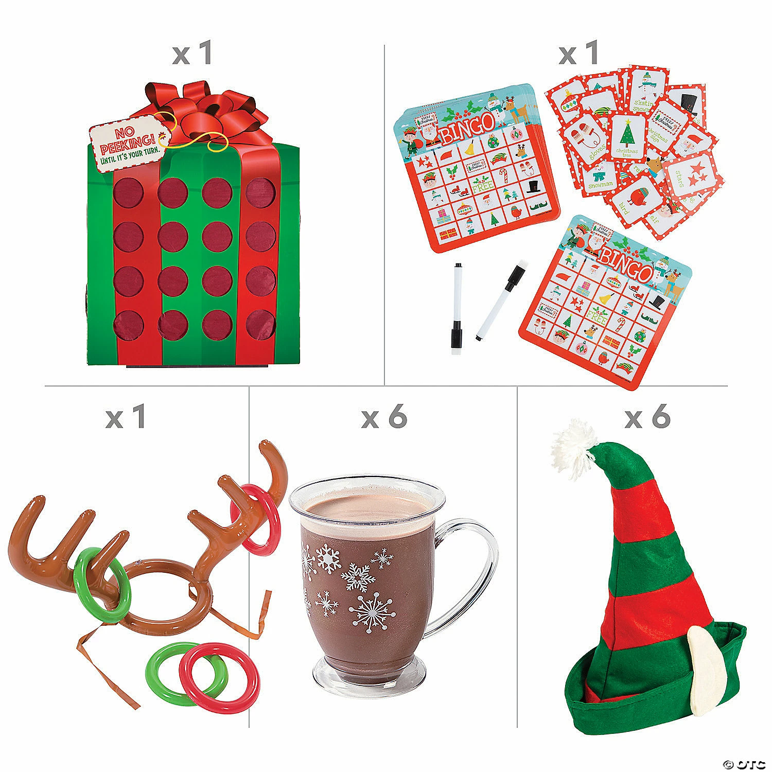 Bring a ho-ho-ho lotta fun to family game night with the help of this kit! Complete with a variety of fun holiday games and other accessories sure to get everybody in the Christmas spirit, this is one gift the whole family can unwrap and enjoy well before Christmas! (19 pcs. per unit) Assortment may vary.Includes:โข 6 Winter Snowflake Plastic Mugs (5″ 18 oz.)โข 1 Plastic Christmas Dry Erase Bingo (Includes 12 each of 6 1/2″ x 6 3/4″ game boards, dry erase markers and calling cards.)โข 6 Felt Elf Hats with Ears (16″ x 24″ circ.)โข 1 Vinyl Inflatable Reindeer Antler Ring Toss Game (Includes a 15″ antler game with four 7″ rings.)โข 1 Christmas Gift Prize Punch Game (Cardboard and tissue paper. 22 1/2″ x 27 1/2″ Assembly required).