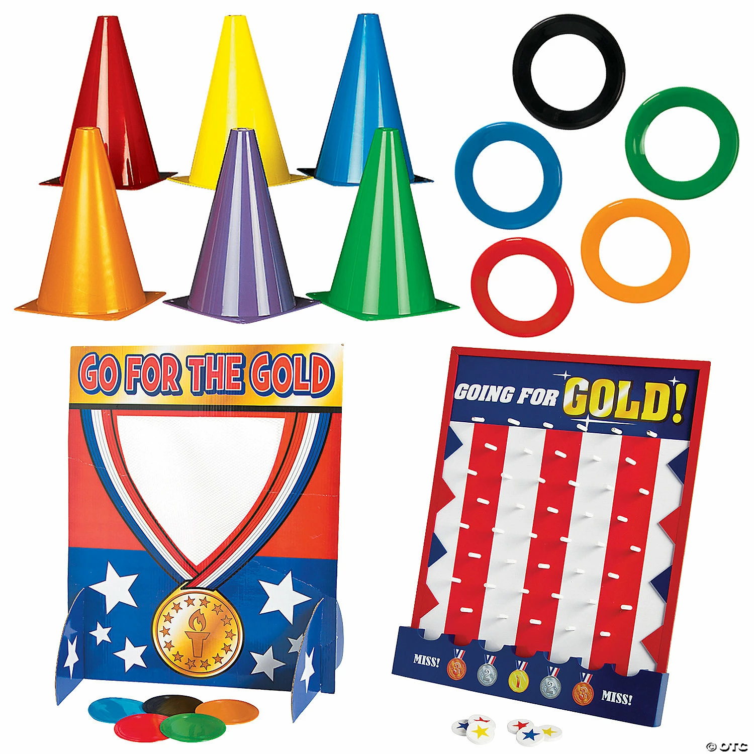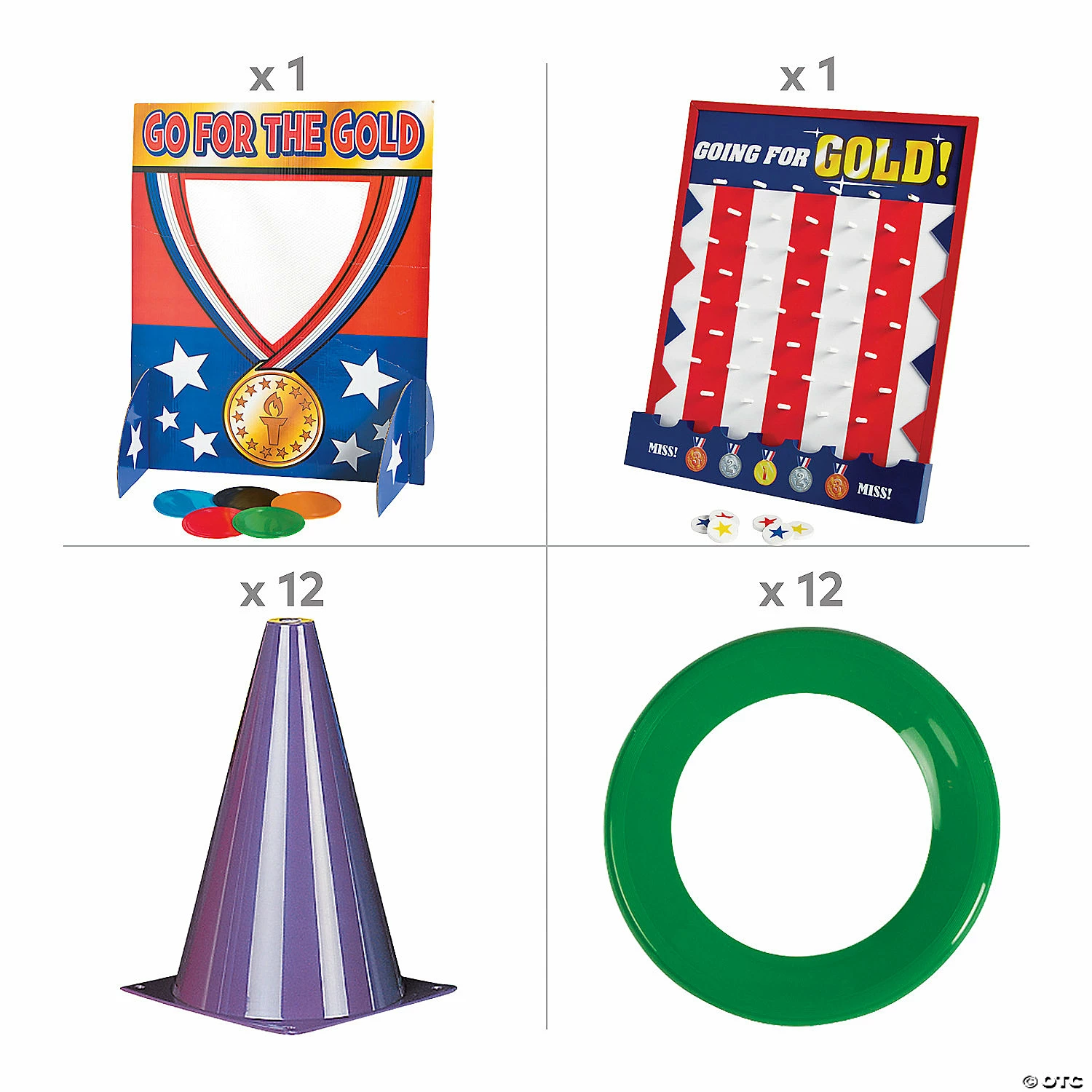 Get ready for the International Games in style with your own game kit! Perfect for outdoor gaming adventures, set up your own Summer Games with this kit! Featuring a variety of games and some outdoor cones and rings to set up your own obstacle course, this is a great way to bring the International Games to your own backyard or community center! (37 pcs. per unit) Assortment may vary.Includes: โข 6-Pc. Cardboard International Games Disc Toss Game (Includes 5 discs and one 3-piece game board. Game board, 16″ x 20″; vinyl discs, 3 1/2″.)โข 12 Plastic International Games Mini Flying Rings (7″ diam.)โข 7-Pc. Wooden International Games Disc Drop Game (Support dowel, 20 1/2″; board, 15 3/4″ x 20 1/4″; discs, 1 1/2″ diam.)โข 12 Plastic Colorful Traffic Cones (5″ x 8 1/2″)