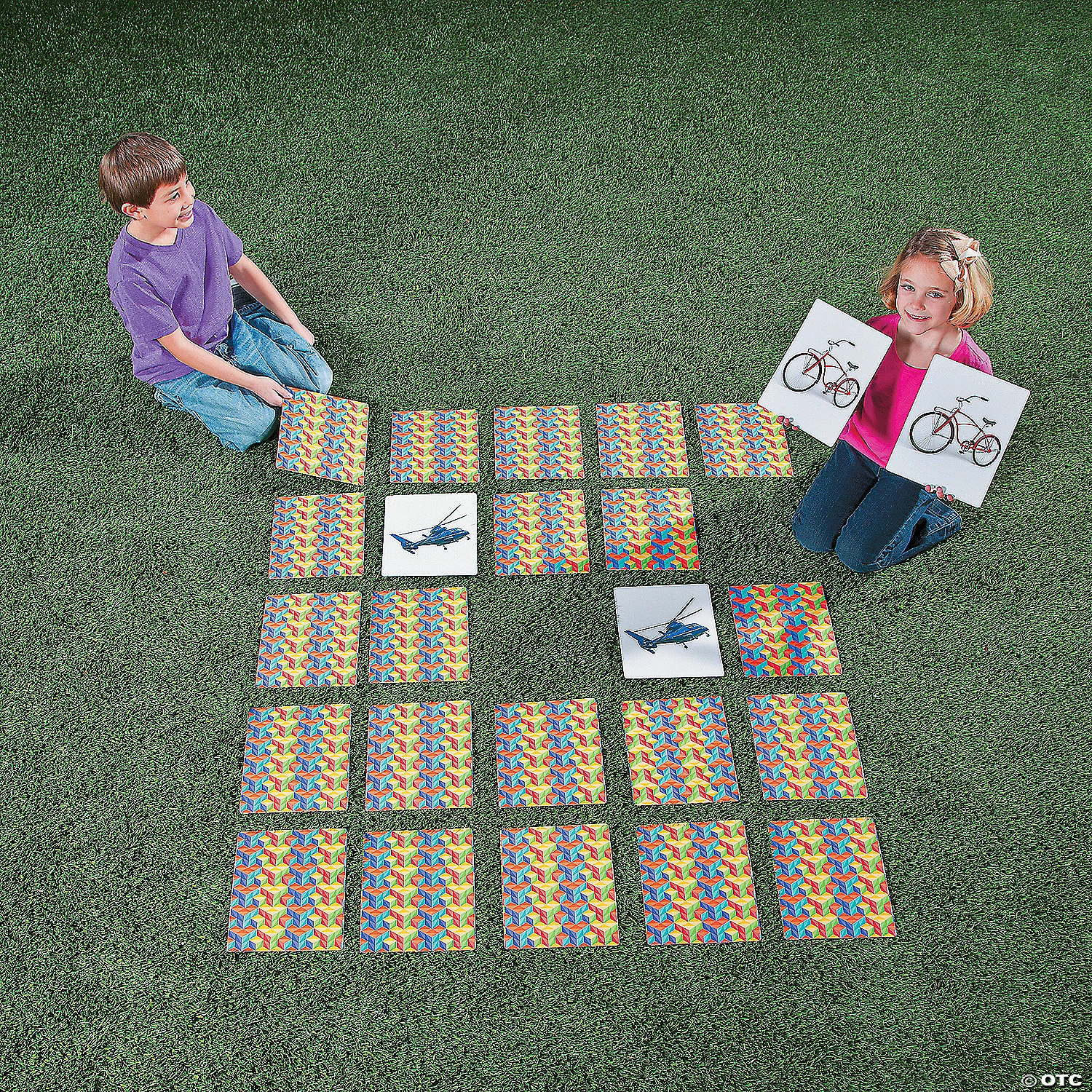 This oversized matching game for kids is big fun! A great addition to your outdoor games, turn all the colorful cards upside down and let young learners flip one over, then try to find its match. Perfect for the playground or the gym on rainy days, this fun memory game includes 24 pairs of cards with real photos of everyday objects. Coated pressboard for durability. Each card, 8″ x 10″. ยฉ OTC