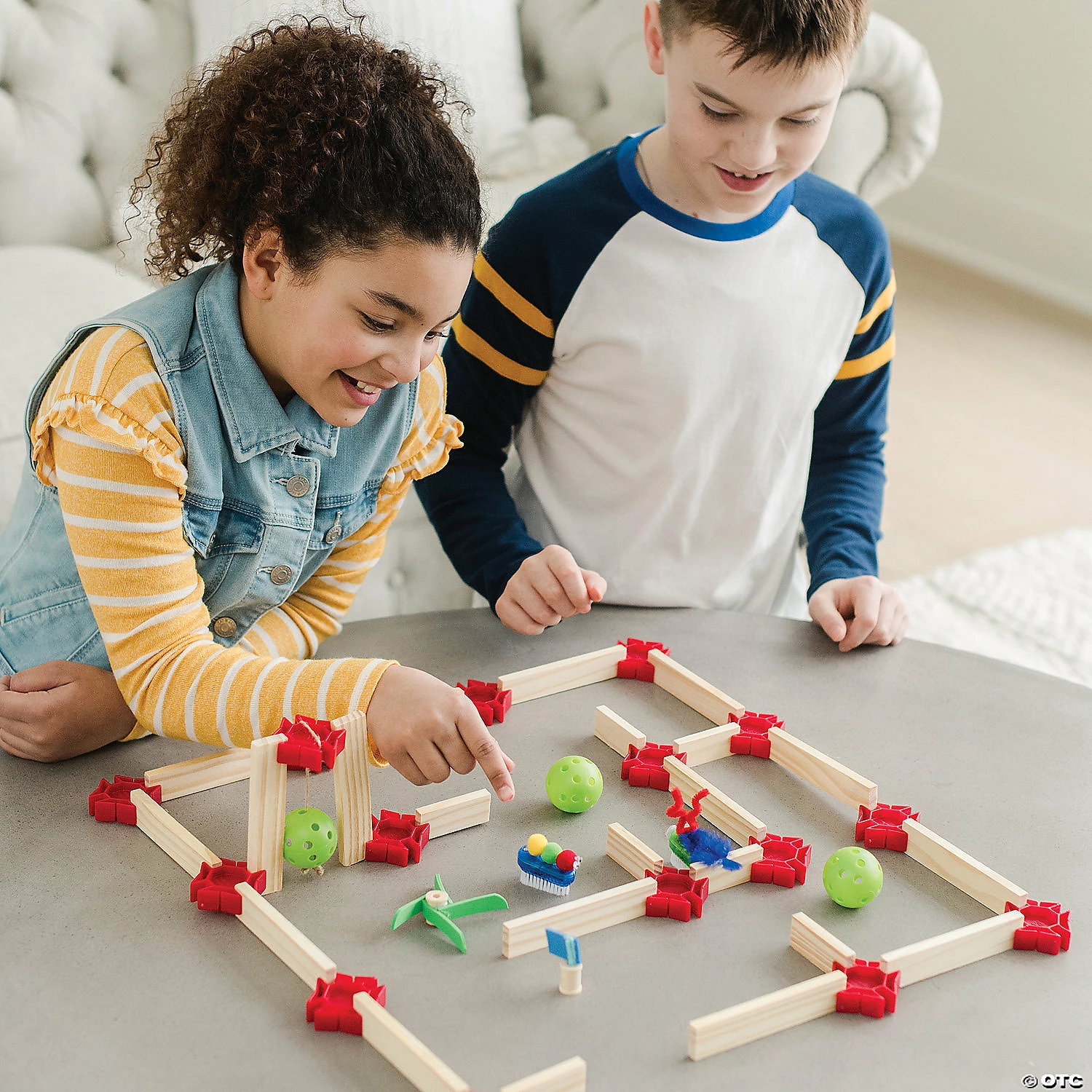 Calling all creative thinkers and curious mindsโit’s time to tinker! The KEVA Maker Bot Maze lets you experiment, innovate and create with precision-engineered KEVA planks and a variety of doodads and gizmos! Customize a pair of motorized bots using crafty items found within this one-of-a-kind kit. The more unique looking, the better! Then construct your maze’s tunnels, doorways, passages and obstacles from the planks and connectors, or by gathering things you have around the house. KEVA Maker Bot Maze is the ultimate engineering toolโwatch in awe as your personalized bot zooms through your hand-crafted maze! Creativity is the key to becoming a master maker. What will you create?โข Strengthens understanding of design, strategizing and proportion โข Creativity meets building โข 30 KEVA Planks, 8 KEVA half planks, 25 connectors, 2 motorized bots, 6 tumble blocks and 3 bumper ballsโข Googly eyes, pipe cleaners, feathers, pom-poms, glue dots, tape, string, felt and craft foam