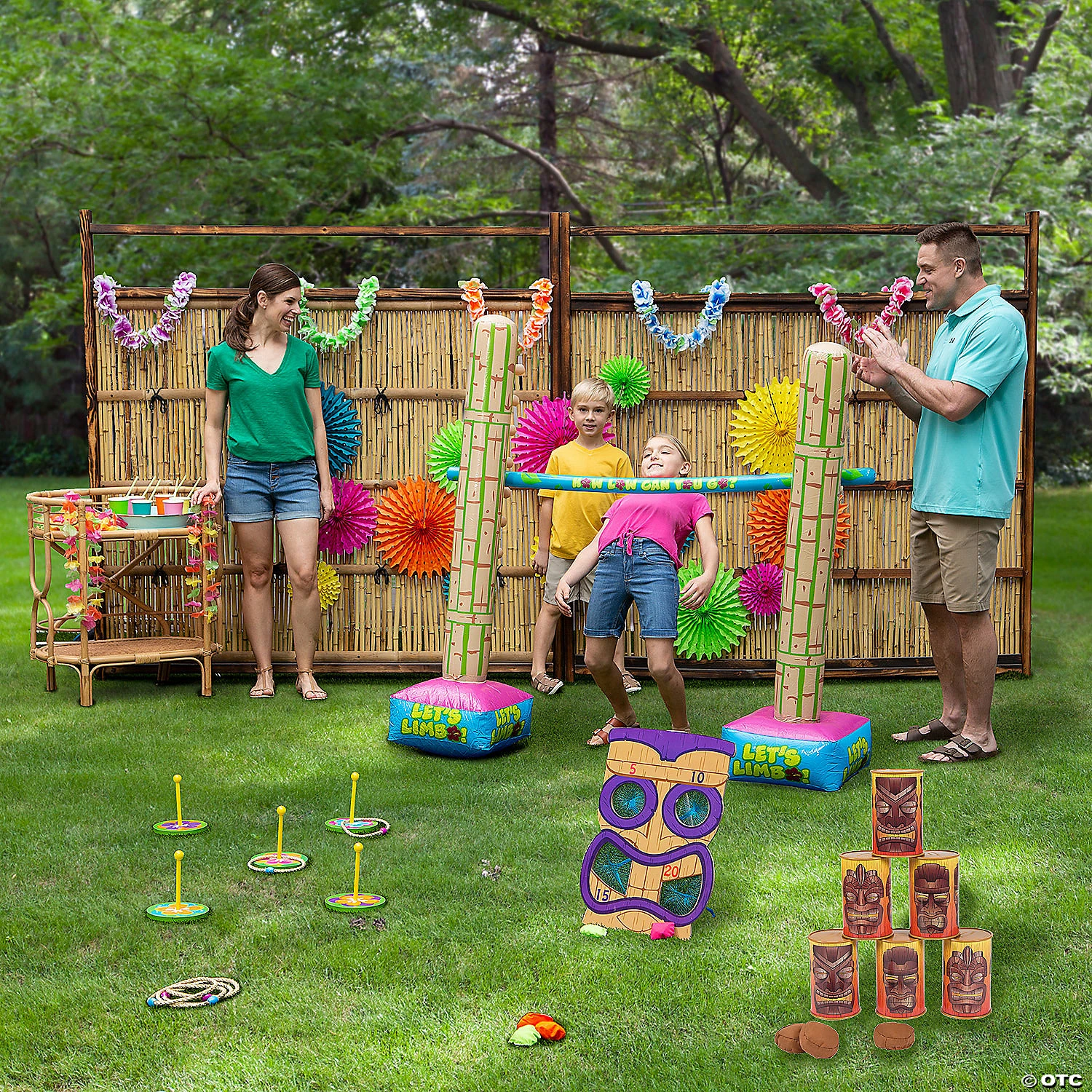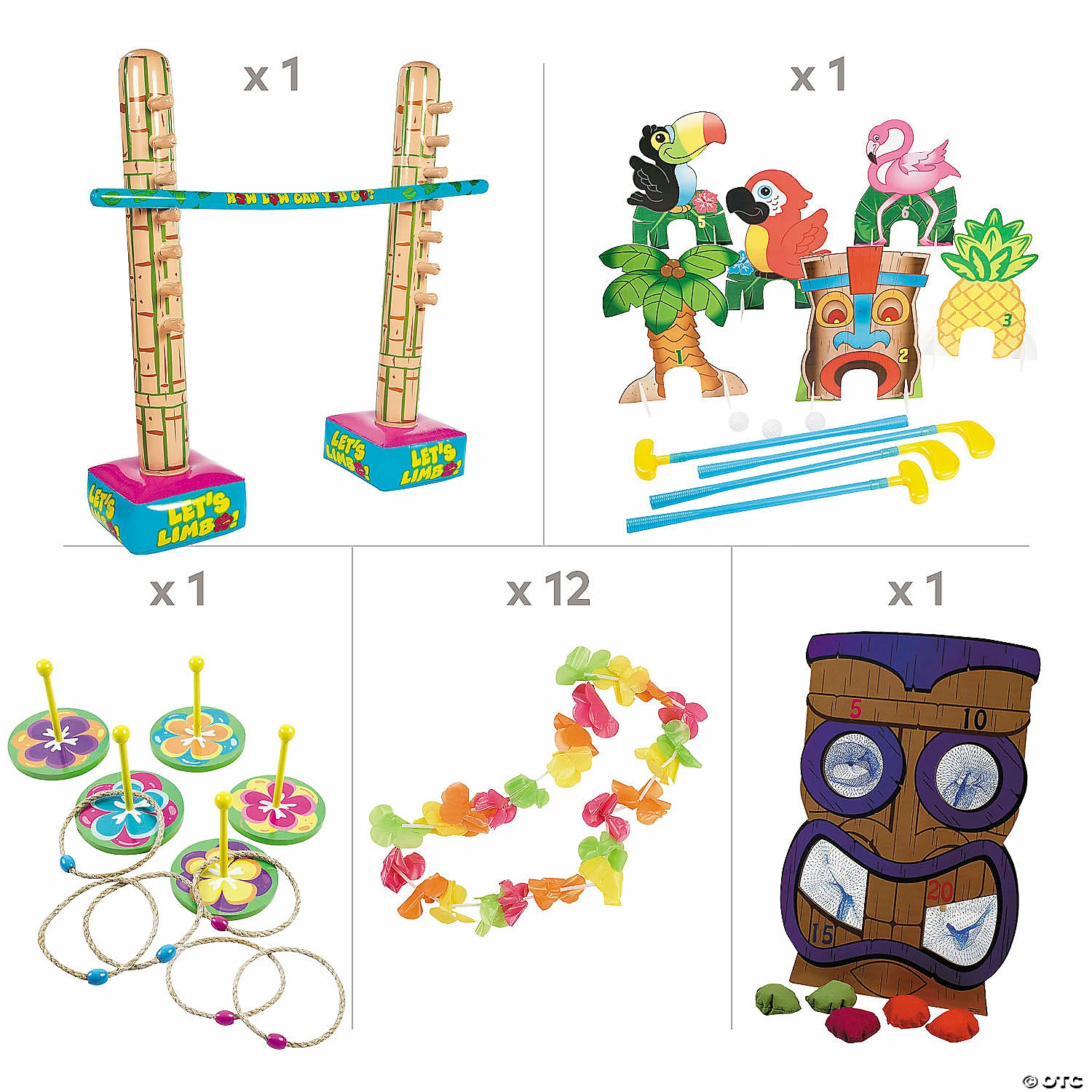 Who needs an island? With this fun kit you can enjoy all the games of a luau in the comfort of your own home. Featuring luau themed games including limbo, ring toss, golf and more, leis are also included to help everyone get into the limbo spirit. Perfect for keeping the family entertained while at home, this kit gets everyone moving and playing! (72 pcs. per unit) Assortment may vary.Includes:โข 1 Wood Luau Disc Drop Game (Includes six 1 1/2″ diam. discs, a 16″ x 20″ gameboard and support pole.)โข 1 Luau Golf Game (Includes four 23″ plastic clubs, six 11″ x 14″ corrugated plastic markers, four 1 3/4″ plastic golf balls, twelve 4 1/2″ x 2 1/4″ corrugated plastic stands for indoor play and twelve 5″ metal rods for outdoor play.)โข 1 Wood Tiki Bean Bag Toss Game (Includes 5 fabric bean bags and support pole.)โข 1 Wood Beach Ring Toss Game (Five bases, 5 3/4″ x 6″; six rope rings, 5″. Simple assembly required. )โข 12 Plastic Bright Neon Leis (36″ x 2 3/4″ diam.)