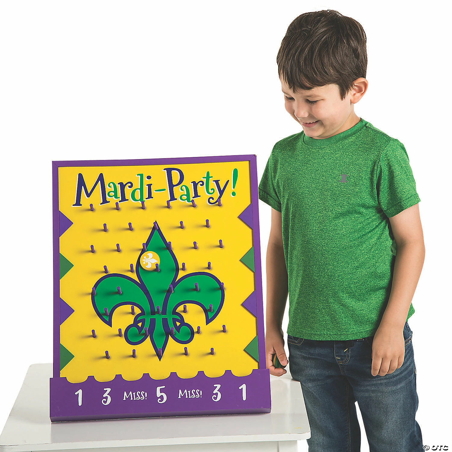 Itβs time to βMardi-Partyβ with this fun disc drop game! The purple, green and yellow game board is the perfect match for the rest of your Mardi Gras party supplies and decorations. Guests will have a blast dropping the discs down the board to try to win a game prize. Shop our site for coordinating Mardi Gras prizes like bead necklaces, toys and candy! Wood. (7 pcs. per set) Support dowel, 20 1/2″; board, 15 3/4″ x 20 1/4″; Disks, 1 1/2″ diam. Simple assembly required. Β© OTC