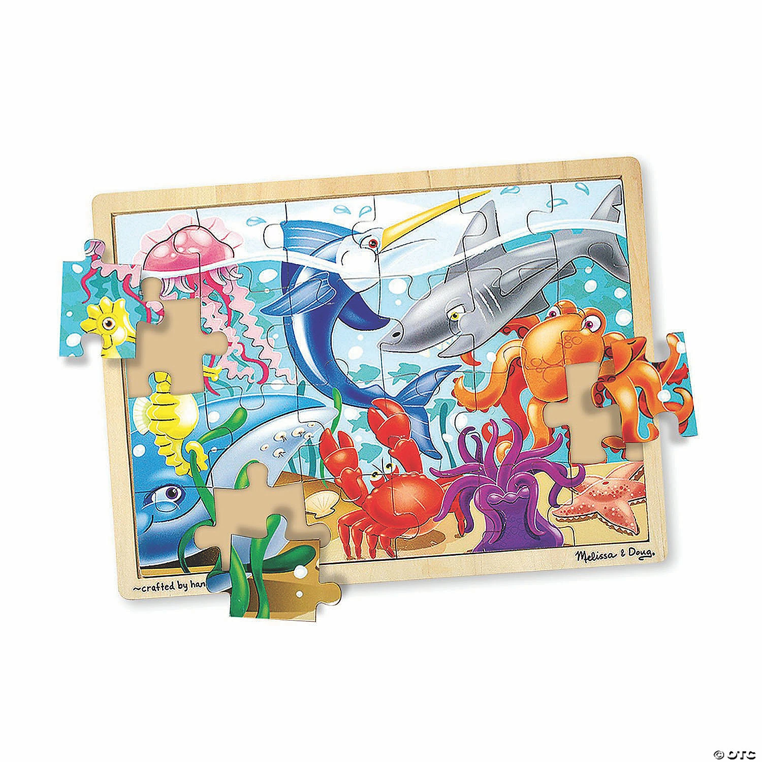 From sea star to jellyfish, this 24-piece wooden jigsaw puzzle is filled with colorful ocean life! Discover the wonders of the deep blue sea by assembling this fascinating underwater scene. This colorful kids’ puzzle comes packaged in a sturdy wooden tray, providing a stable play surface and easy storage. Product measures 15.75″L x 11.75″W and weighs 1.4 lbs.