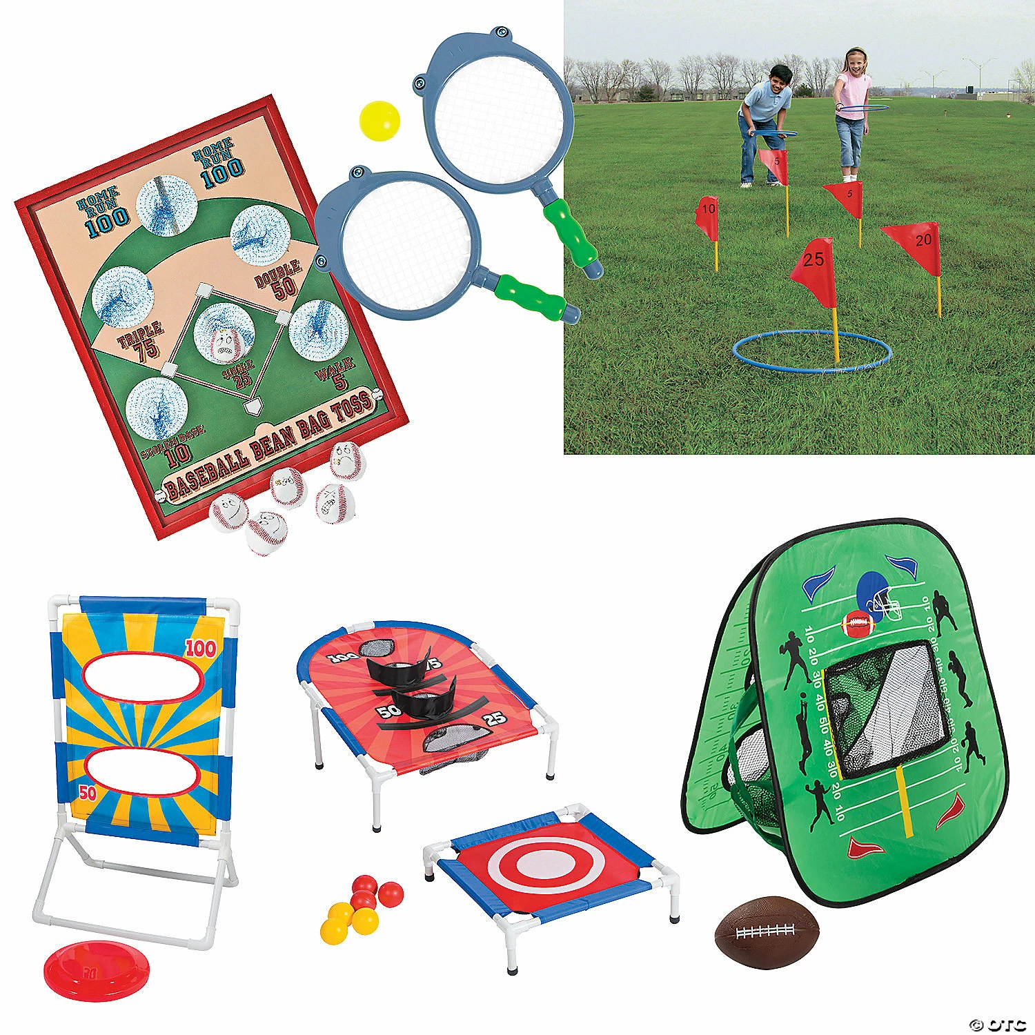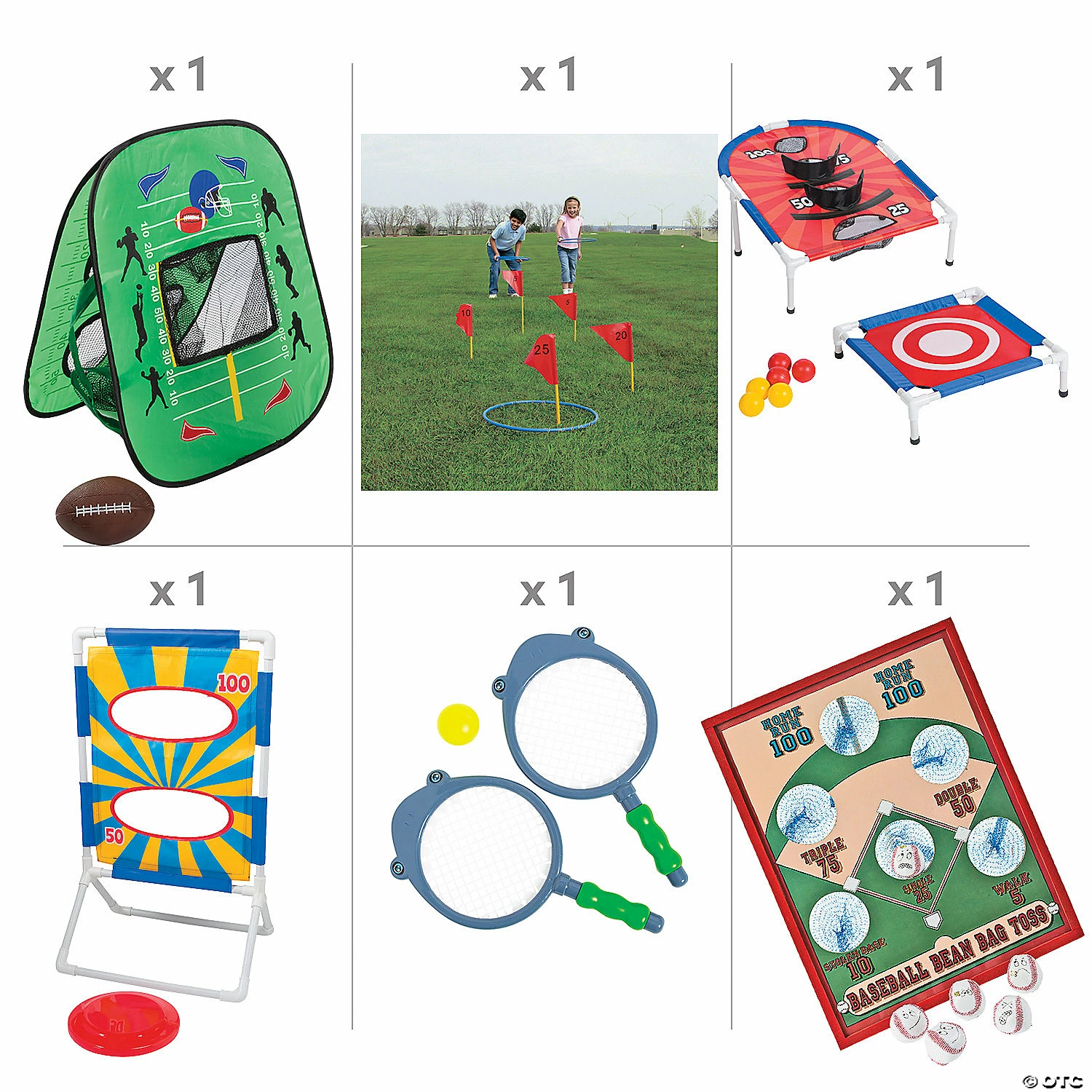 Transform an outdoor space into a game space with this fun kit full of entertaining games for the outdoors. Kids will have a blast with the games in this kit including ball toss, flying discs, football toss and more. Bring this kit to a park or campsite for no more claims of boredom from kids and more family fun! (41 pcs. per unit) Assortment may vary. Simple assembly required.Includes:โข 1 Plastic and nylon Ball Bounce Toss Game (8 pcs. per unit. Game board, 38 1/2″ x 38 1/2″; bouncer, 21″ x 21″; 7 foam balls, 2 1/4″ diam.)โข 1 Wood Baseball Bean Bag Toss Game (7 pcs. per unit. Includes five 2″ vinyl bean bags, one 16″ x 20 1/2″ board and a 20 1/2″ pole stand. Simple assembly required.)โข 1 Plastic Flying Disc Toss Game (Includes 1 disc, one polyester game board that slides onto a sturdy tube stand. 18″ x 30 1/2″ Simple assembly required.)โข 1 Polyester Football Toss Game (2 pcs. per unit. Football game includes one 18 1/2″ polyester board and 1 football. Simple assembly required.)โข 1 Plastic Jumbo Ring Toss Game (14 pcs. per unit. Rings, 16″; stakes, 12″ – 18″; flags, 8″ x 7″.)โข 3 Plastic Shark Racket & Ball Game Sets (9 pcs. per unit. Paddles, 7″ x 13 1/2″; ball, 2 1/2″.)