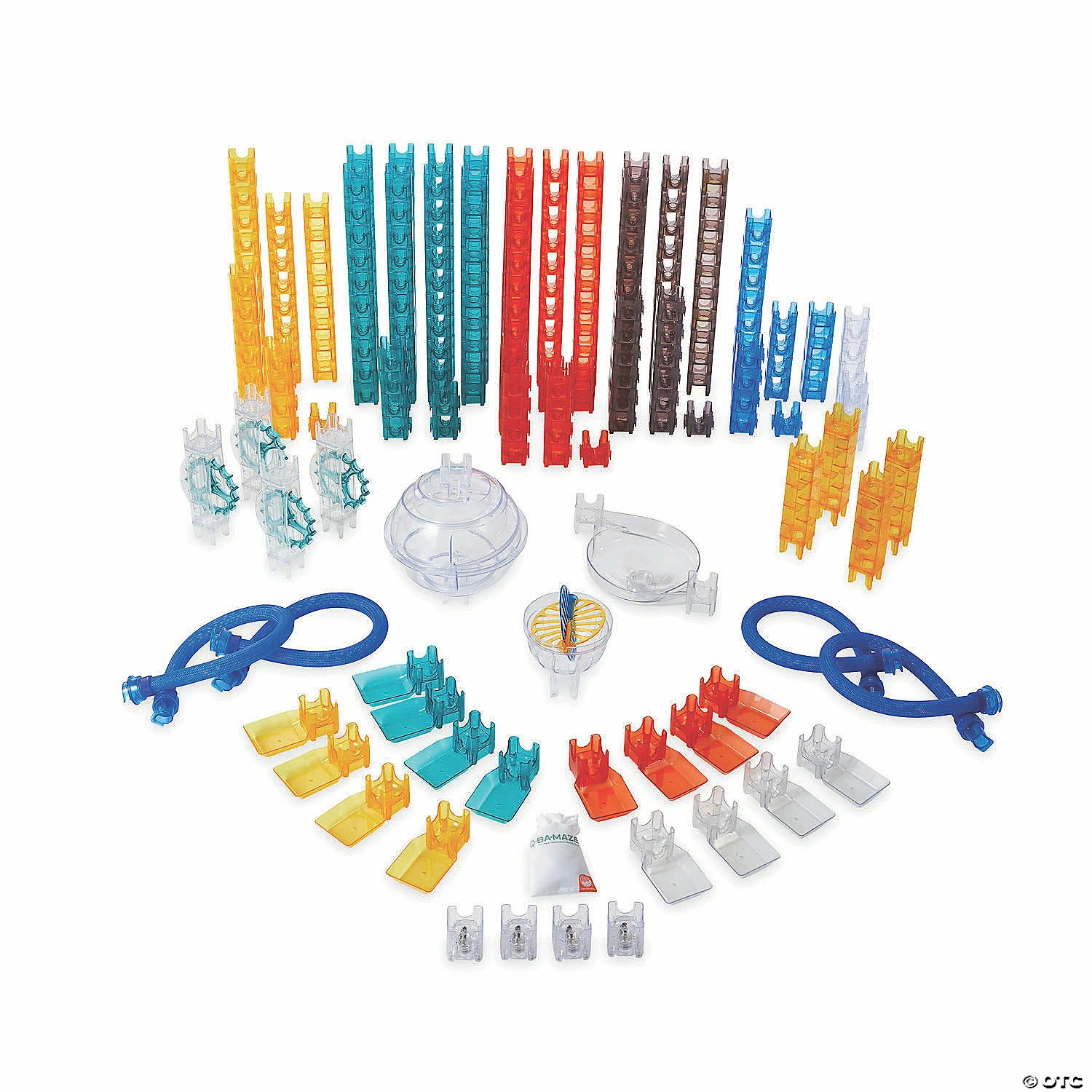The Q-BA-MAZE Rocket Set of cosmic proportions with over 330 a-MAZE-ingly fun pieces: 4 light-up cubes, 4 speed sprockets, 4 coaster tubes, 4 cascade stilts, 1 roto catcher, 1 marble vortex, 1 spiral sphere, 16 marble catchers, and 262 colorful cubes.
