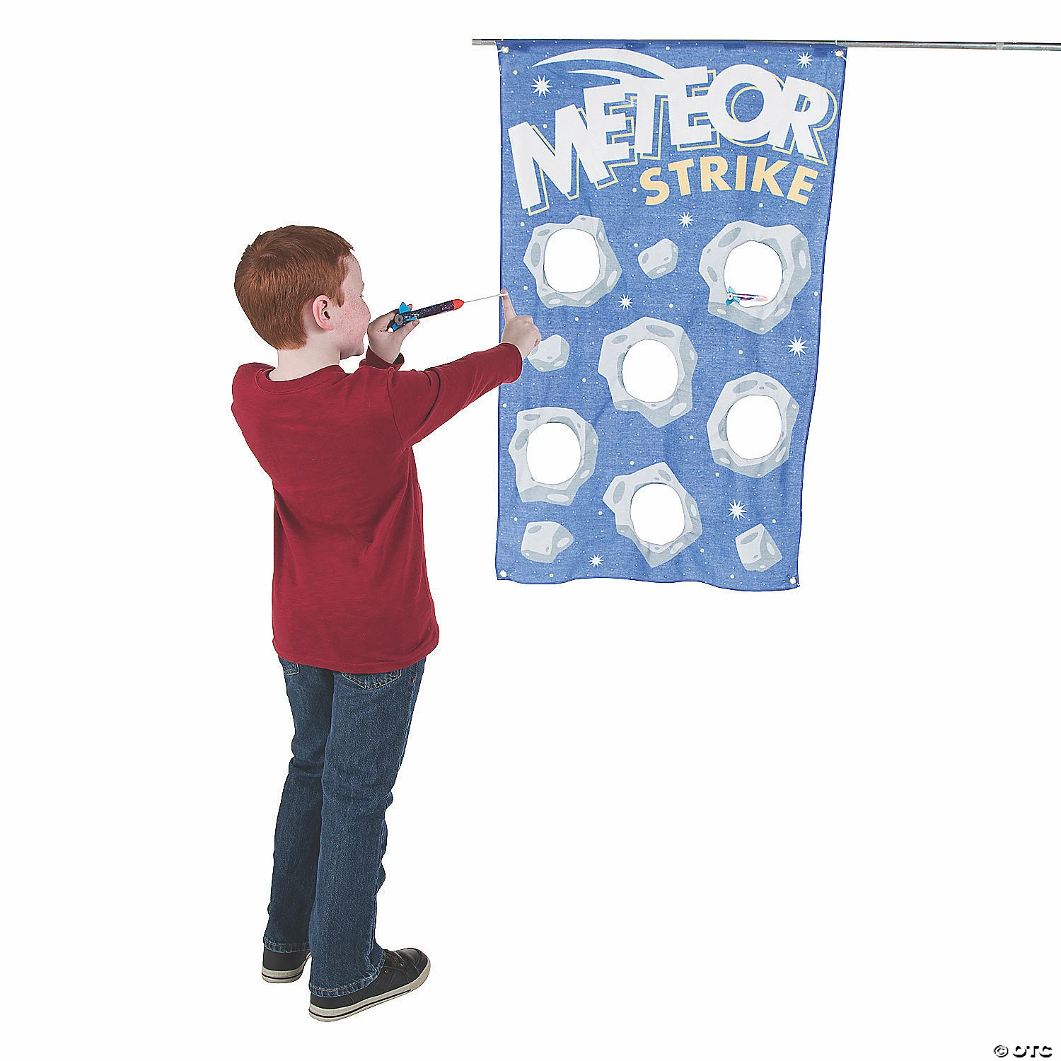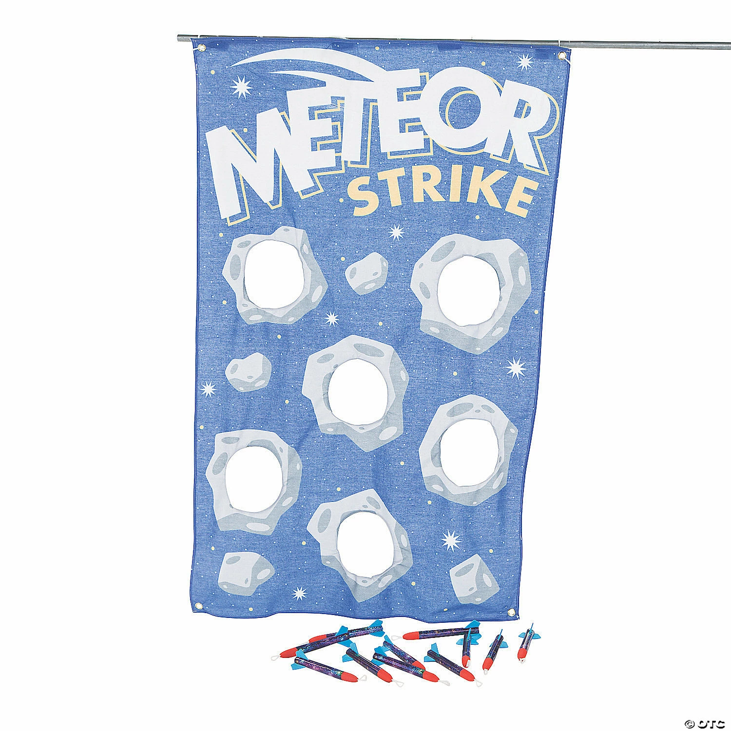 Need a new game for your space theme party? This fun game tests your shooting skills. Try to shoot the included foam rocket flyers into the holes of the canvas backdrop. Foam and canvas. (13 pcs. per set) Twelve rocket flyers, 7 1/4″; backdrop, 35″ x 55″. Includes grommets for hanging. ยฉ OTC