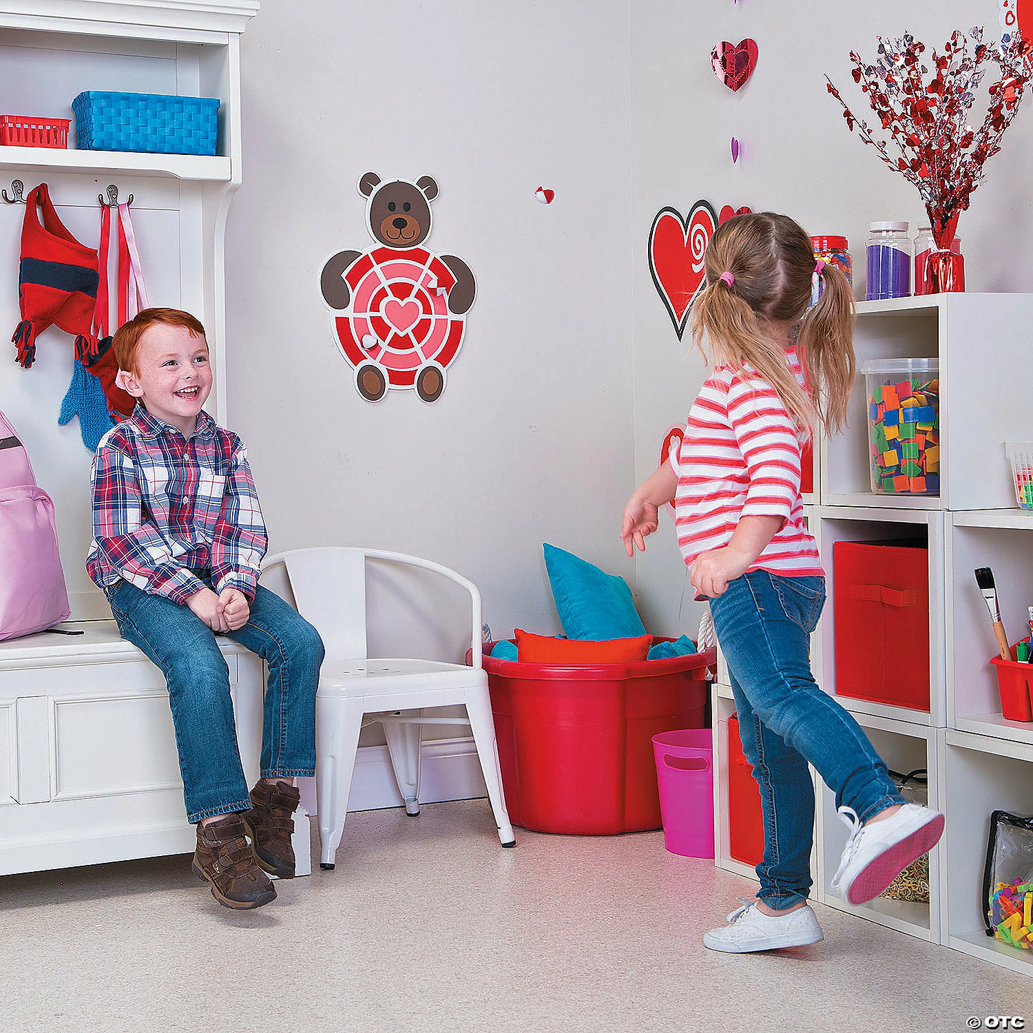 Take aim at Valentine fun with this beary cute dartboard! Kids can take turns tossing balls at the teddy bear to win. This Valentine party game includes 4 soft balls with grip surfaces. (5 pcs. per set) Dartboard, 14 1/2″ x 19″, balls, 2″. © OTC