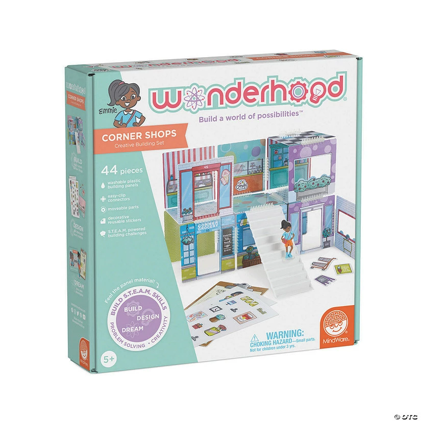 Kids can build their own downtown space, including an Ice Cream Shop and a General Store with the Wonderhood Corner Shops building set. 16 beautifully illustrated scenes on double-sided, glossy plastic panels can be rearranged into all sorts of imaginative combinations: just clip them together with the durable plastic connectors! Each Wonderhood set comes with an Activity Journal filled with stories and fun architectural challenges kids can take on to put their problem-solving skills to the test! Add the Corner Shops to other Wonderhood sets to create a whole city!β’ Creative and re-designable play-house set develops fine motor skills and self-confidenceβ’ Activity Journal challenges encourage development of S.T.E.A.M. skills and spatial reasoningβ’ Introduces concepts of architectural design and structural engineeringβ’ All Wonderhood toys are compatible; collect them all to add to the fun!β’ Includes 44 pieces: washable plastic building panels, easy-clip connectors, moveable parts, decorative reusable stickers and 1 figurine, plus S.T.E.A.M. powered building challenges