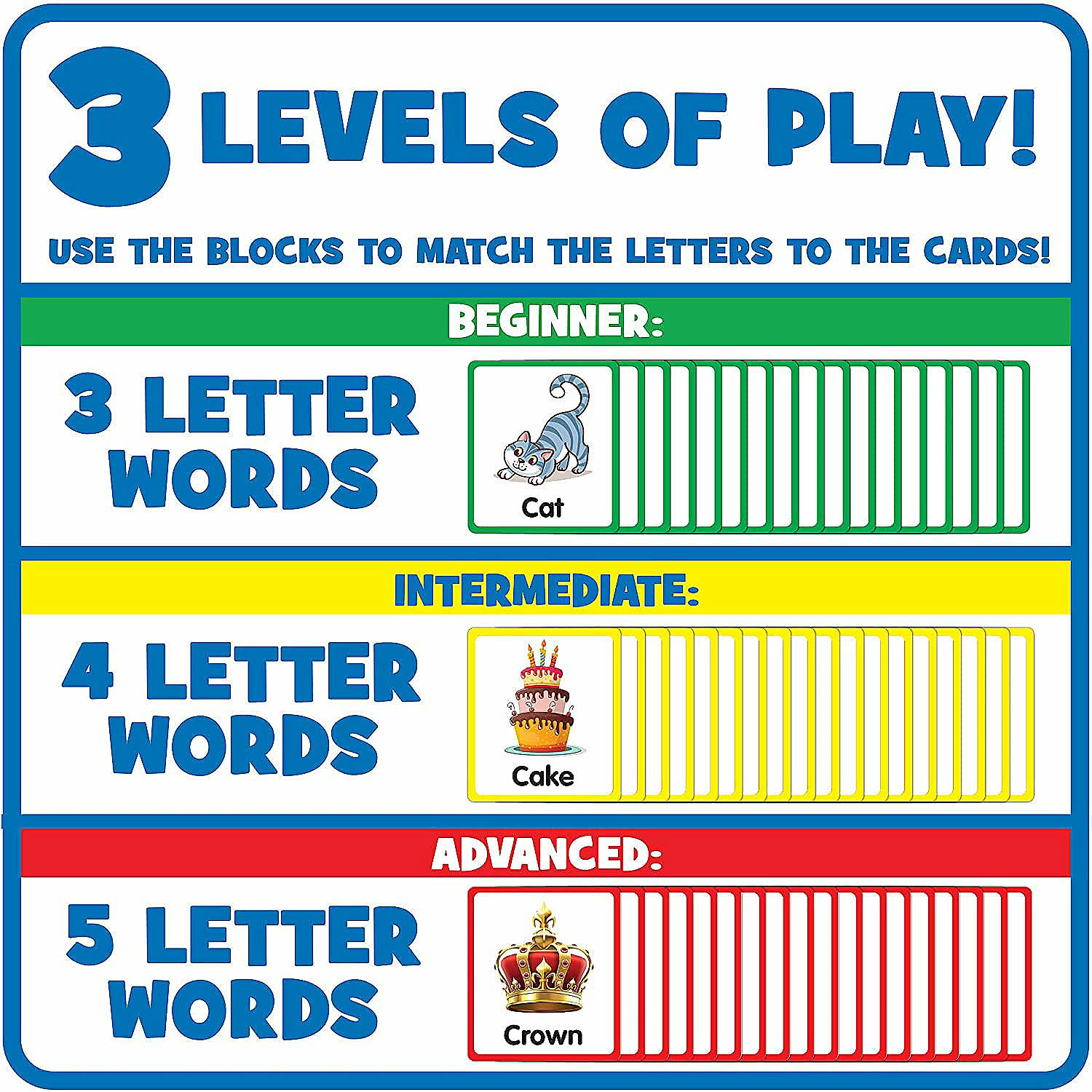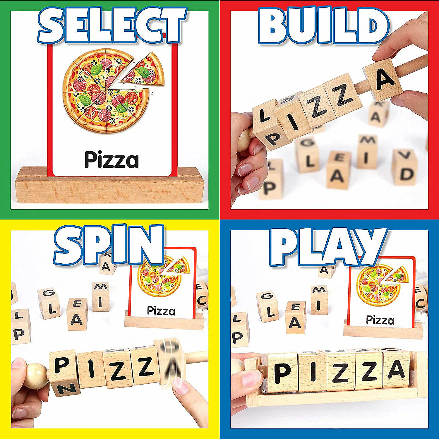 Form Fun Words By Spinning and Matching: You will need to find the Wooden ABC blocks that make up each word, place them on the spinner, mix it up, and find the word again; There are 3 levels included and endless ways to stay entertained